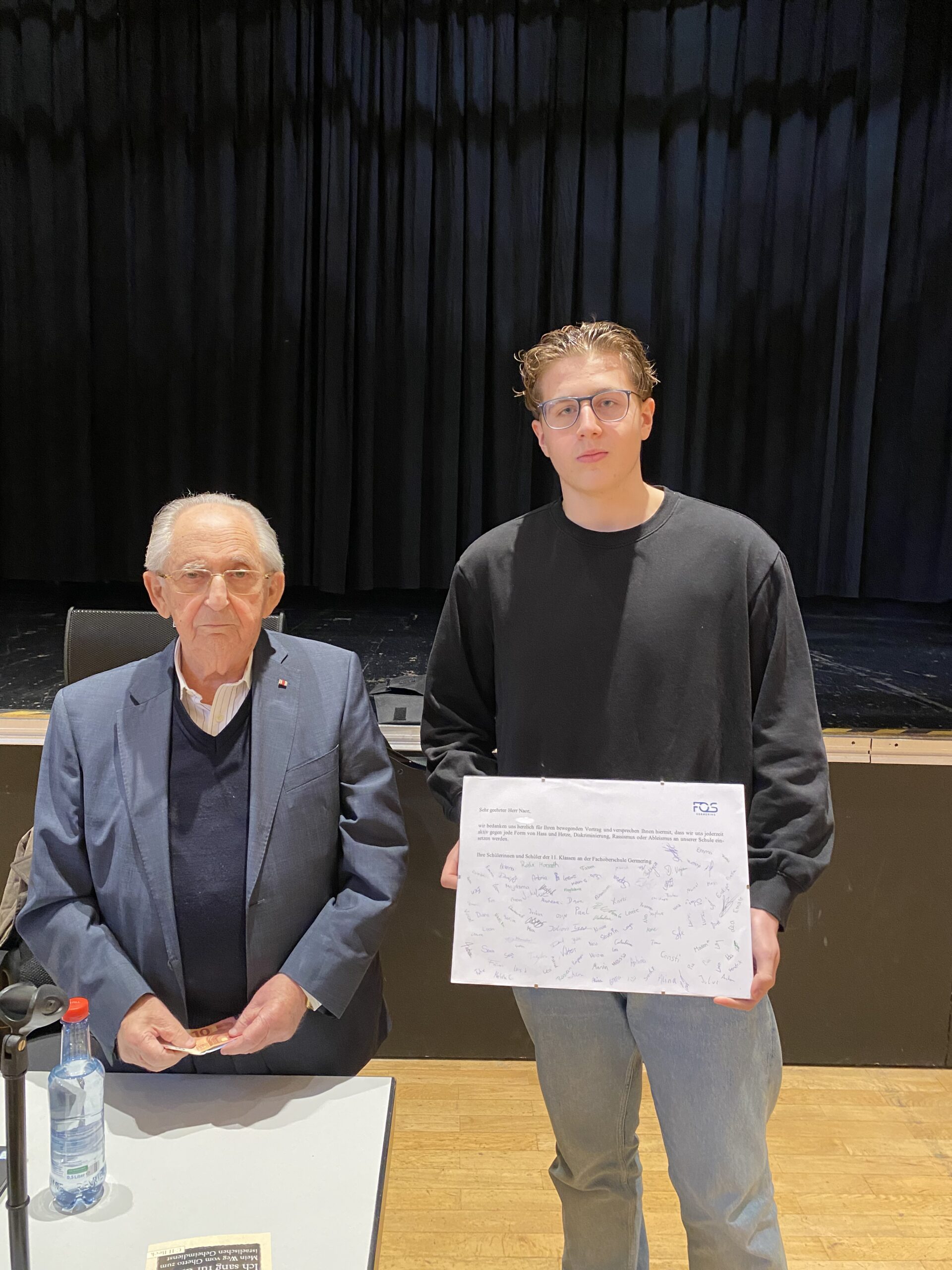 Als Dank für seinen Vortrag überreichte der Schülersprecher Muhamed Krasniqi Herrn Naor im Namen der FOS Germering ein Plakat, auf dem die Jugendlichen mit ihrer Unterschrift das Versprechen abgegeben haben, sich jederzeit aktiv gegen jede Form von Hass und Hetze, Diskriminierung, Rassismus oder Ableismus an unserer Schule einzusetzen.