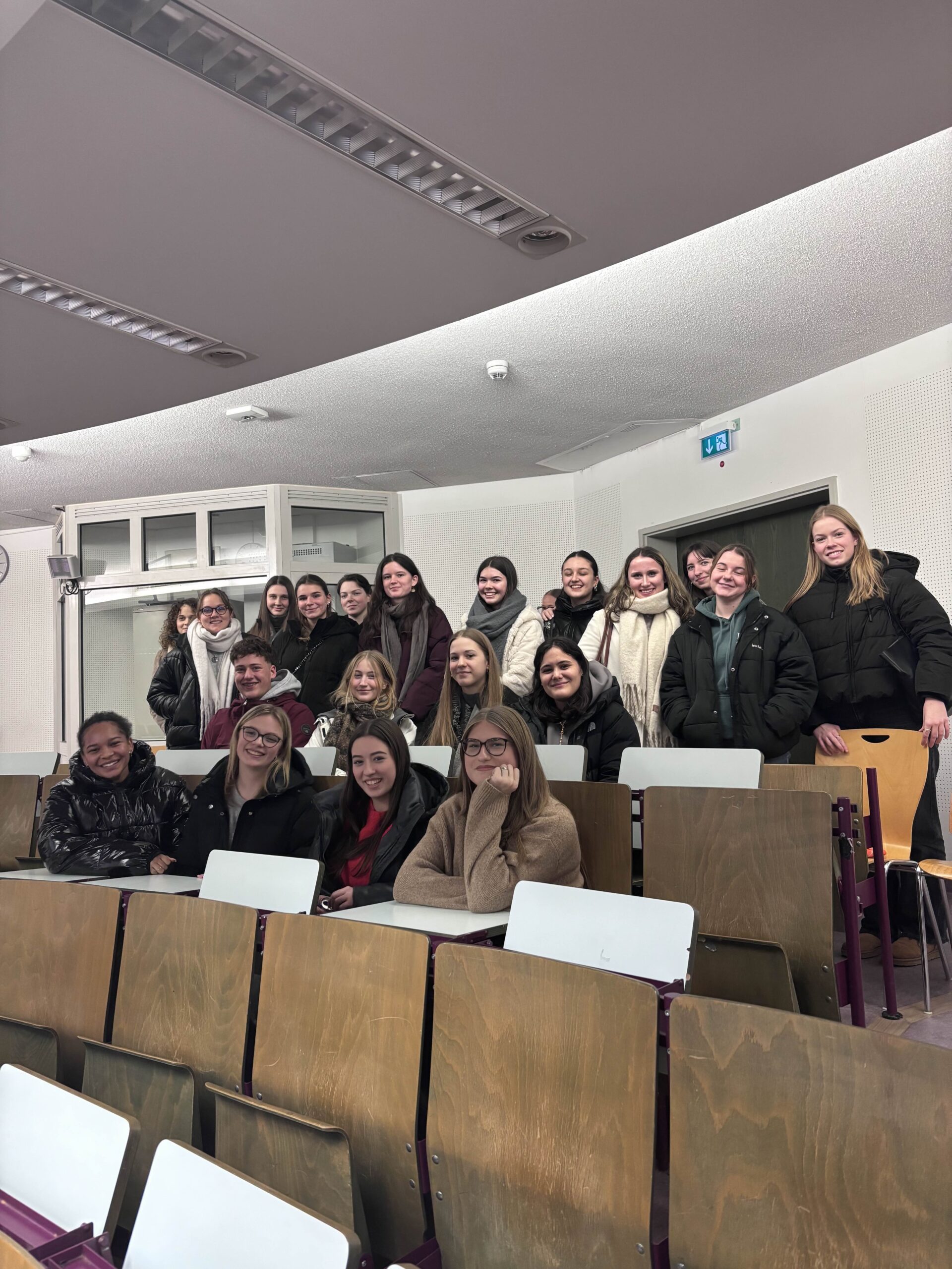 Am 13.01.2025 besuchten Schülerinnen und Schülern der 12. und 13. Klassen des Sozialwesens zusammen mit ihren Lehrkräften Frau Schön und Frau Tsartsari eine Psychologie-Vorlesung an der LMU. Die Schülerinnen und Schüler konnten hier Uni-Luft schnuppern und dabei auch erleben, wie das Fach Psychologie an der Uni gelehrt wird. Dass Prof. Maier in seiner Vorlesung auch viele Themen wie Emotionen oder Lerntheorien angesprochen hat, zeigte ihnen auch, wie viel Vorwissen sie vom PP-Unterricht bereits mitbringen.