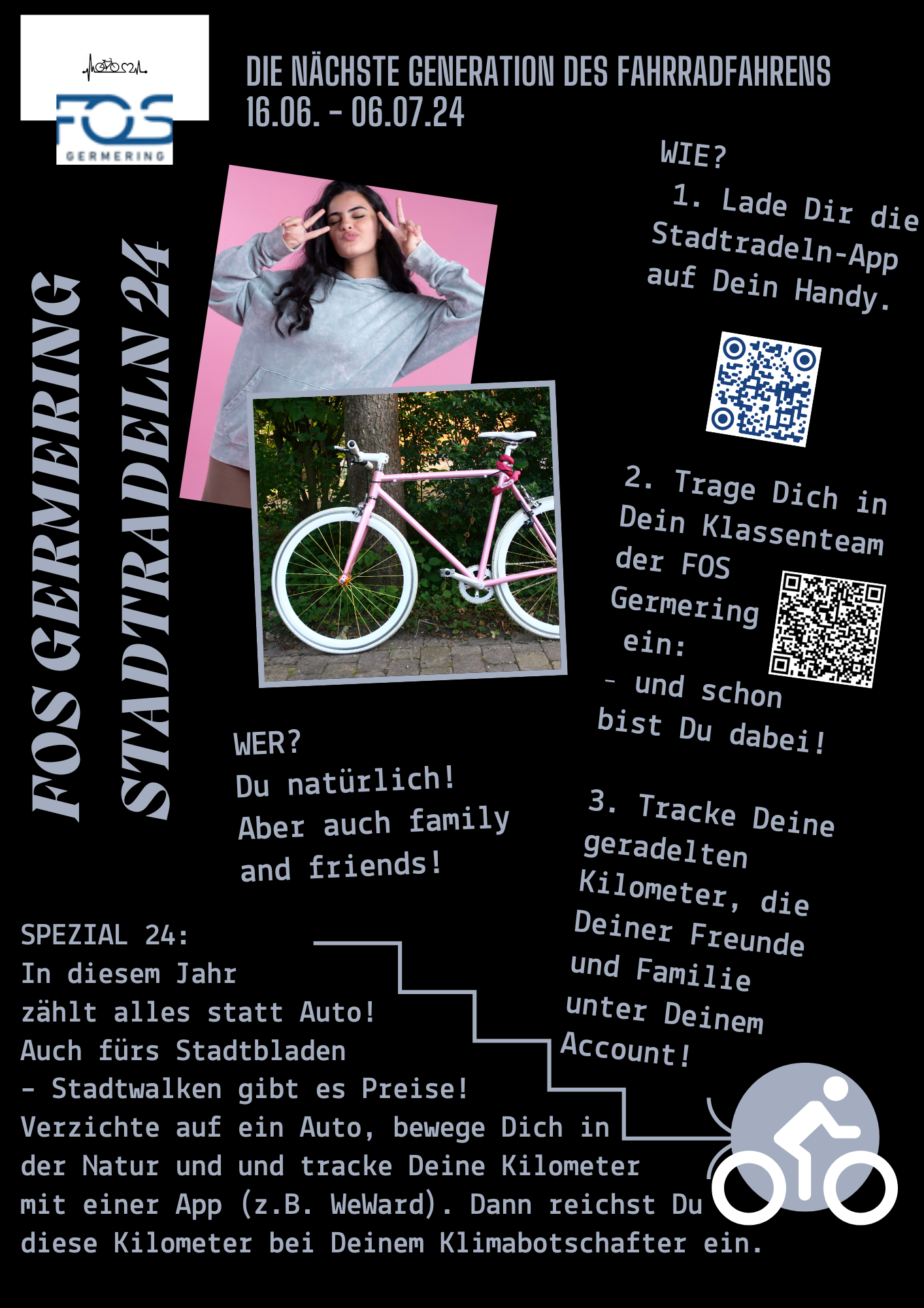 vom 16. Juni bis 6. Juli 2024 heißt es wieder: Auf die Räder, fertig, los! Unsere Schule beteiligt sich an der bundesweiten Aktion Stadtradeln. Ladet Euch die App herunter, tretet Eurem Klassen-Team bei und sammelt zusammen mit Freunden und Familie fleißig Kilometer für Eure Klasse und für die FOS Germering! Am Ende der Laufzeit werden die geradelten Kilometer gezählt und die besten Teams ausgezeichnet.