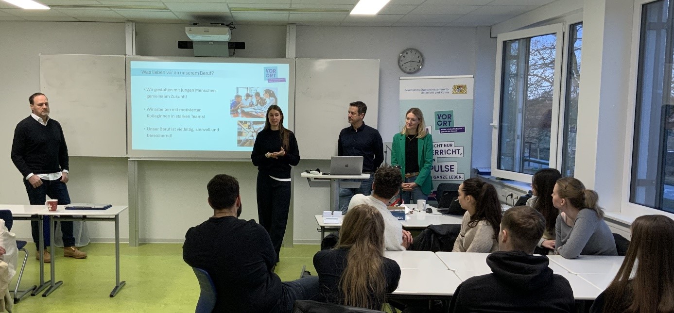 Am 14.01.2026 hatten unsere Schülerinnen und Schüler der 12. und 13. Klassen die Möglichkeit, sich über den Beruf als Lehrkraft zu informieren. Die Veranstaltung fand in diesem Schuljahr bereits zum dritten Mal im Rahmen des sogenannten „VOR ORT“-Projekts statt. Ein Team bestehend aus vier Lehramtsbotschaftern, also Lehrkräften verschiedener Schularten, kam dazu an die FOS Germering, um Einblicke in den Beruf als Lehrkraft zu geben und mit den Schülerinnen und Schülern ihre Erfahrungen aus erster Hand zu teilen.