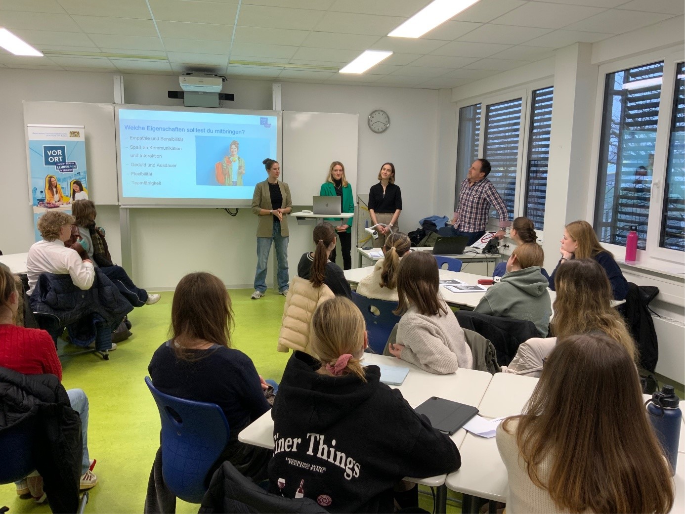 Am 22. Januar 2025 hatten die Schülerinnen und Schüler der 12. und 13. Jahrgangsstufe der FOS Germering die Gelegenheit, mehr über den Lehrberuf zu erfahren. Im Rahmen des vom Bayerischen Staatsministerium für Unterricht und Kultus ins Leben gerufenen „VOR ORT“-Projekts im Rahmen der Kampagne „Zukunft prägen. Lehrer/-in werden!“ besuchten bereits zum zweiten Mal Lehrkräfte aus verschiedenen Schularten die FOS Germering, um Einblicke in den Lehrerberuf zu geben.