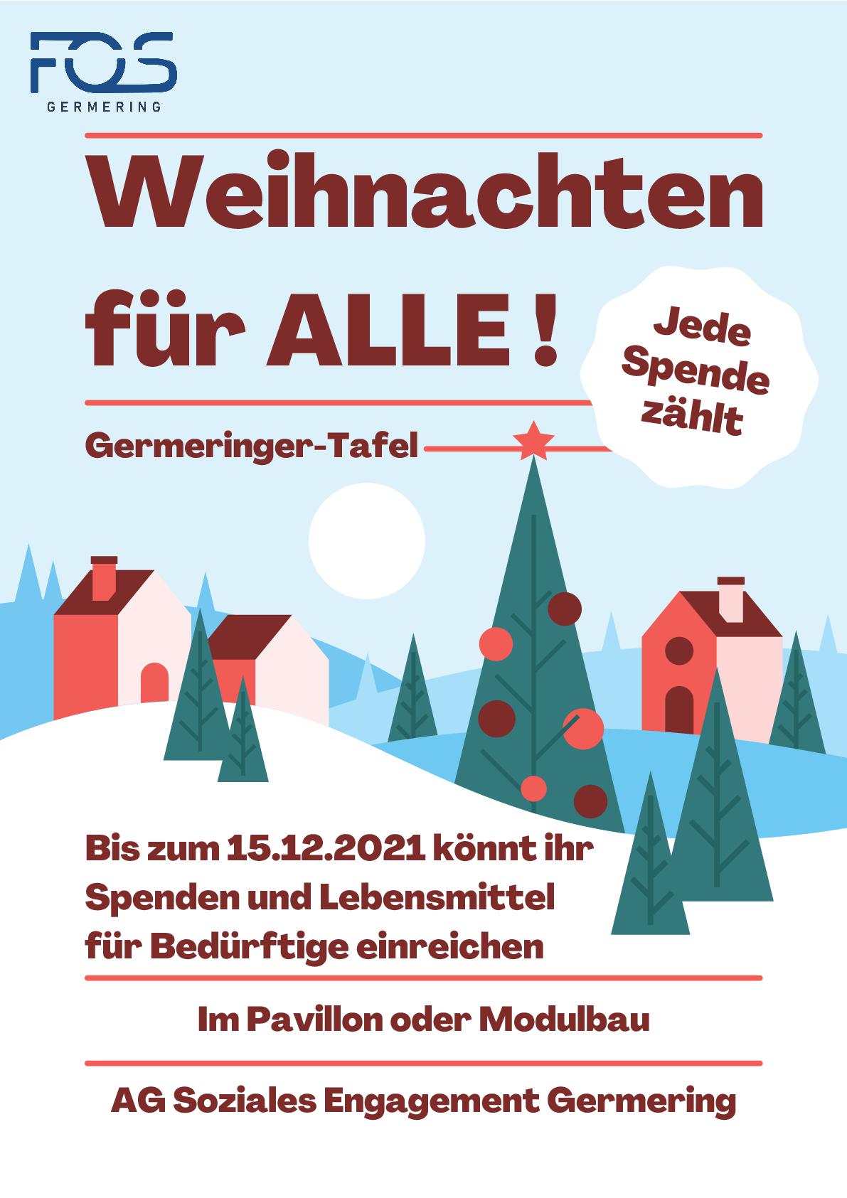 In den letzten Wochen wurden im Rahmen der Aktion „Weihnachten für ALLE“ in den Klassen fleißig Spenden für die Germeringer Tafel gesammelt. Am Mittwoch, 15.12.2021, war es dann soweit: sämtliche haltbaren Lebensmittel, Hygieneprodukte und weihnachtliche Leckereien wurden Kistenweise in zwei (!) Autos verladen und an die Tafel übergeben.